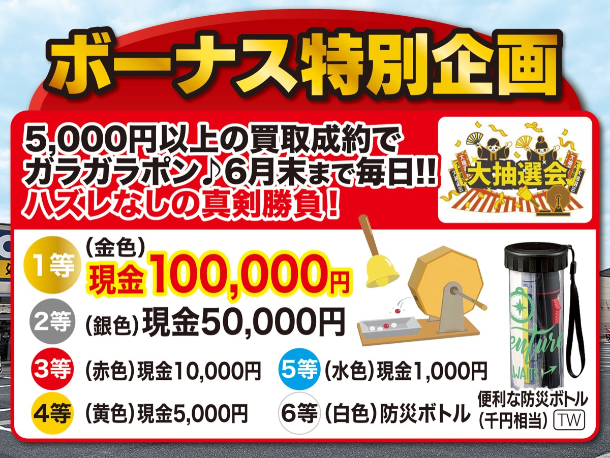 買取専門店「おたからや」ライズモールひばりが丘店が、6月もガラポン企画を延長!買取5千円以上の成約で最高10万円が当たるガラポン抽選会を実施。6等でも暮らしに役立つ「防災ボトル」を進呈中(数量限定)。