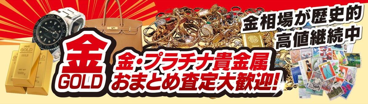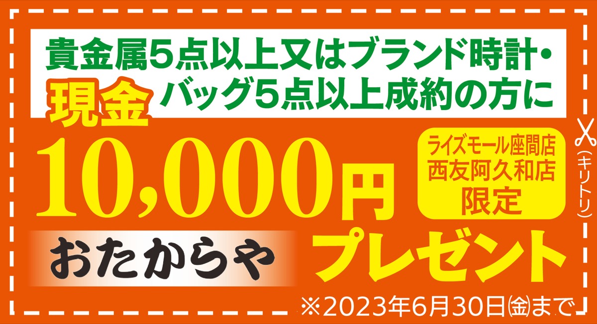 さらに、腕時計や貴金属、ブランド品のバッグ、記念金貨や金歯など、同店指定の品物5点以上成約時に下記クーポンを提示すると、成約額に上乗せ1万円も実施中。業界大手につき安心査定。
