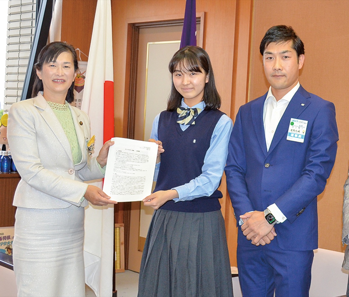 市役所で岩城さんは「さまざなことに挑戦して成長につなげたい。自分が関心を持っているフェアトレードの意義を広めたい」と抱負を述べ、地域で行う啓発活動に向け、用意した企画書を佐藤市長に手渡して協力を求めた。