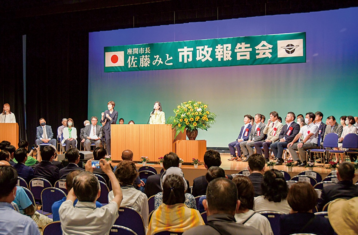 座間市の佐藤弥斗市長が10日、ハーモニーホール座間小ホールで行われた市政報告会に出席し、就任からこれまでに取り組んだ市の事業などを集まった約350人の支持者らに報告した。報告会は後援会が主催した。