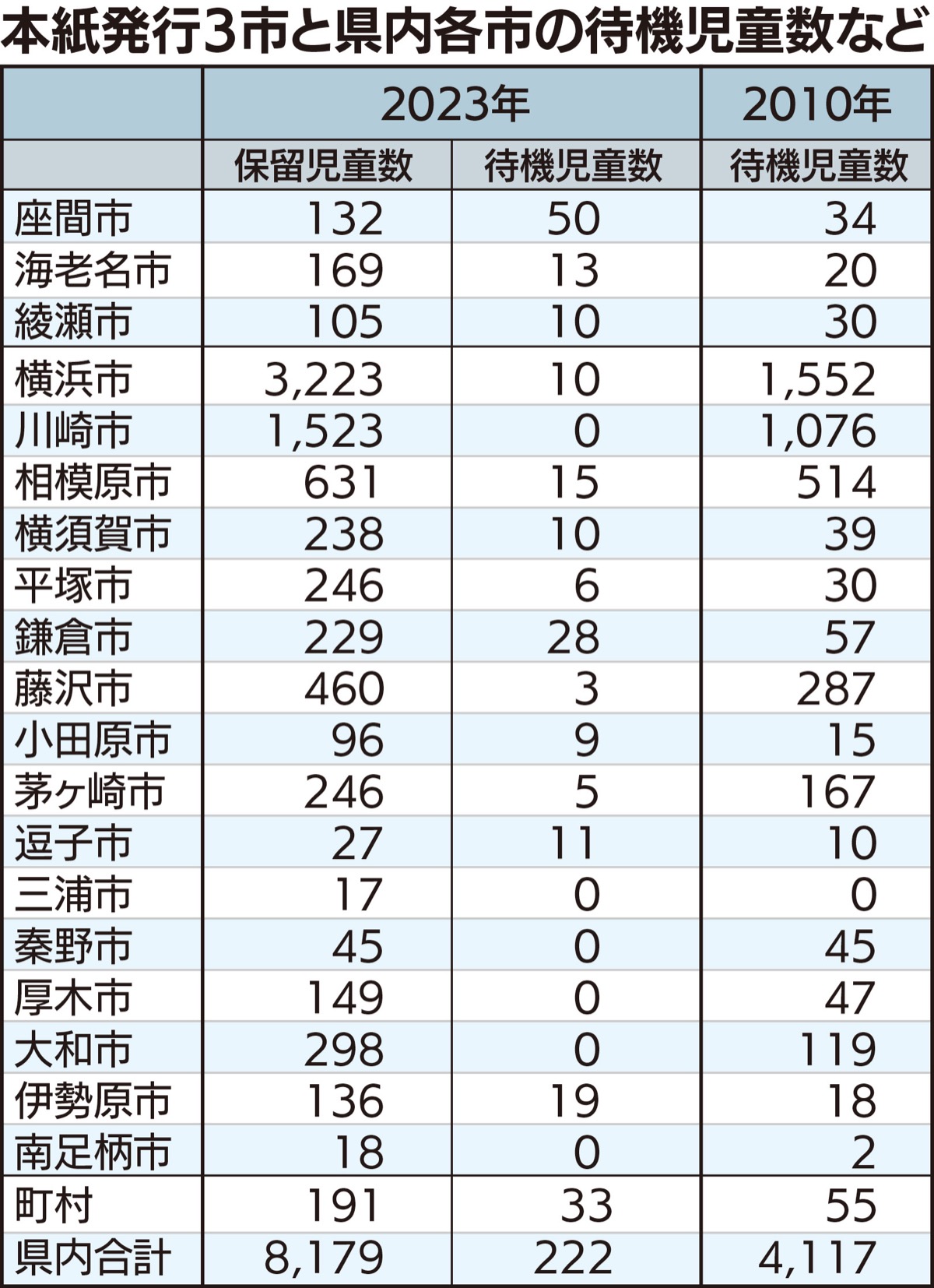 3年連続で県内最多だった座間市の待機児童数は昨年と同じ50人で4年連続の県内最多となった。