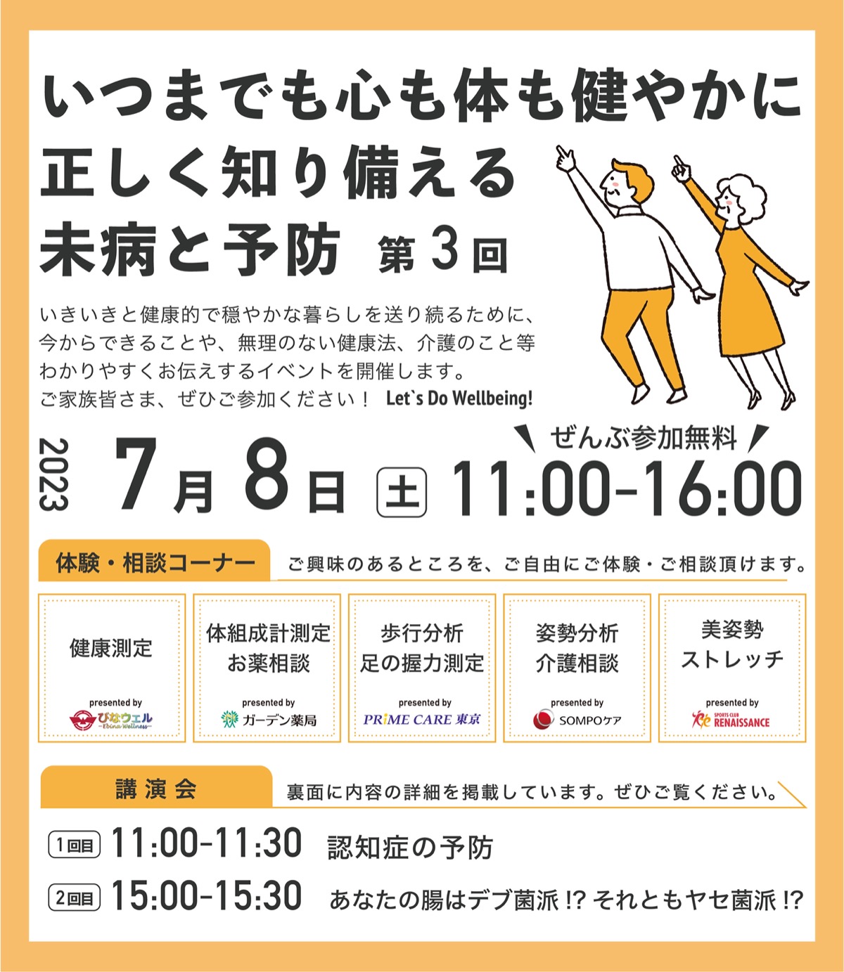 午前11時から『認知症の予防』(講師/医療法人社団NALUの尾崎聡理事長)、午後3時からは『あなたの腸はデブ菌派!?それともヤセ菌派!?』(ガーデン薬局薬剤師)の講演もある。参加無料、申込不要。