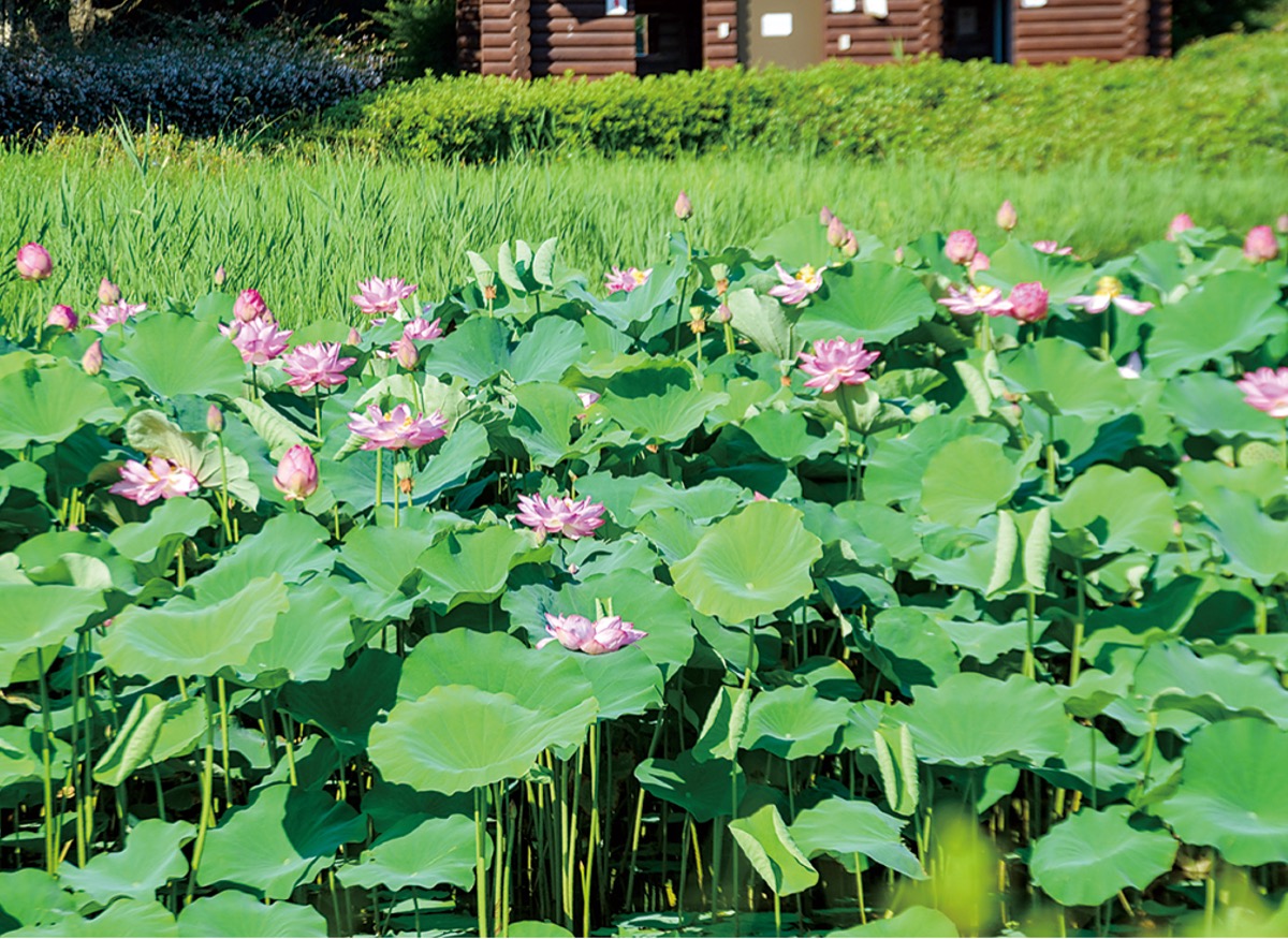 綾瀬市の蟹ヶ谷公園でハスが見ごろを迎えている(=写真・7月17日撮影)。約1000株が順に花開き、湿生園の水面を彩って来園者の目を楽しませている。