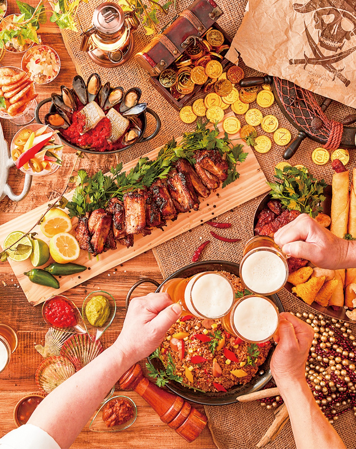 今年のテーマは、「カリビアンナイト〜海賊の宴〜」。会場には、カリブ海沿岸の国々の名物料理をはじめ、肉や魚介をふんだんに使用し、贅を尽くした料理がズラリ。ビュッフェ形式で提供するほか、数量限定のタイムサービスにはスペアリブやサーモンのケイジャングリルも登場する。