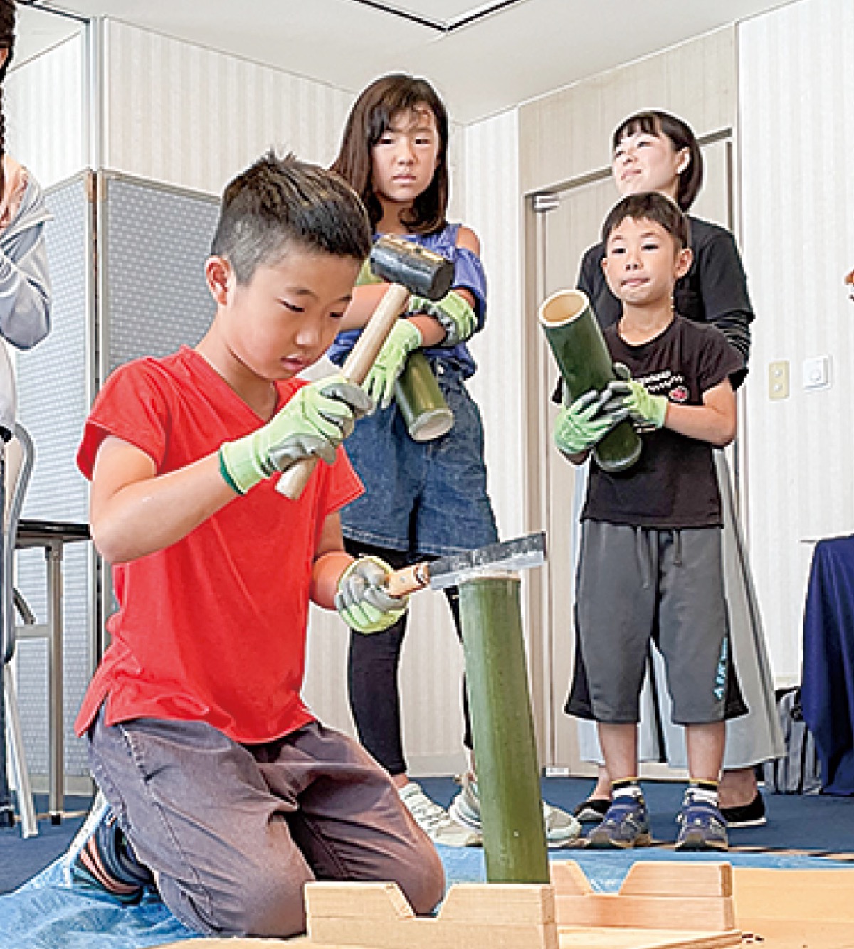 竹箸づくりでは同ホテルの日本庭園に生えていた竹を材料とし、参加者らは鉈とハンマーを使って細く割り、小刀とヤスリを駆使して形を整えていた。