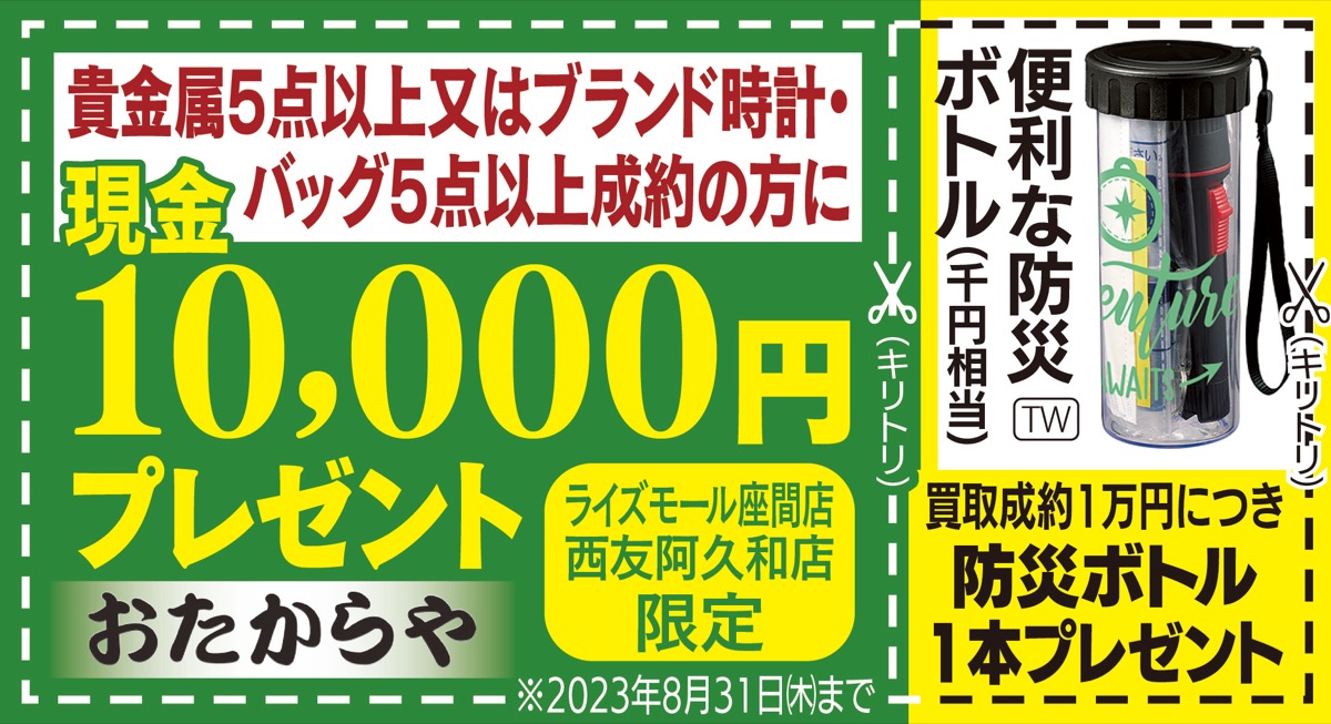 ライズモール座間ひばりが丘店2階の買取専門店「おたからや」では、「傷だらけだけど値段が付くのか」、「チェーンが切れてしまっている」など、どんな状態でも査定が可能。腕時計、ブランド品、切手、古銭、宝石など幅広く対応している。特に金やプラチナは相場価格が歴史的高水準で、金歯や記念硬貨など高額査定が続出中。小さな貴金属にも驚きの値段がつくことも。