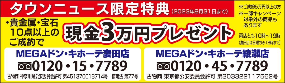 8月にリニューアルしたばかりの「MEGAドン・キホーテ綾瀬店」1階の買取専門店「おたからや」では、貴金属や宝石の買取を強化中。10点以上の買取成約で、買取金額と別に現金3万円を進呈する。スタッフは「査定は無料です。金の相場が高値のうちに、昔使っていたアクセサリーなどを査定しませんか」と話す。