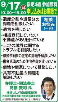 相鉄不動産販売・海老名店では、弁護士による相続・不動産の無料個別相談会を9月17日(日)に行う。相談を受けるのは弁護士・司法書士の高橋賢司氏。相続や債務整理、離婚時の財産分与などを中心に、不動産に関する多くの相談を受けており「今まで悩んでいた問題が解決できた」など参加者から好評だ。