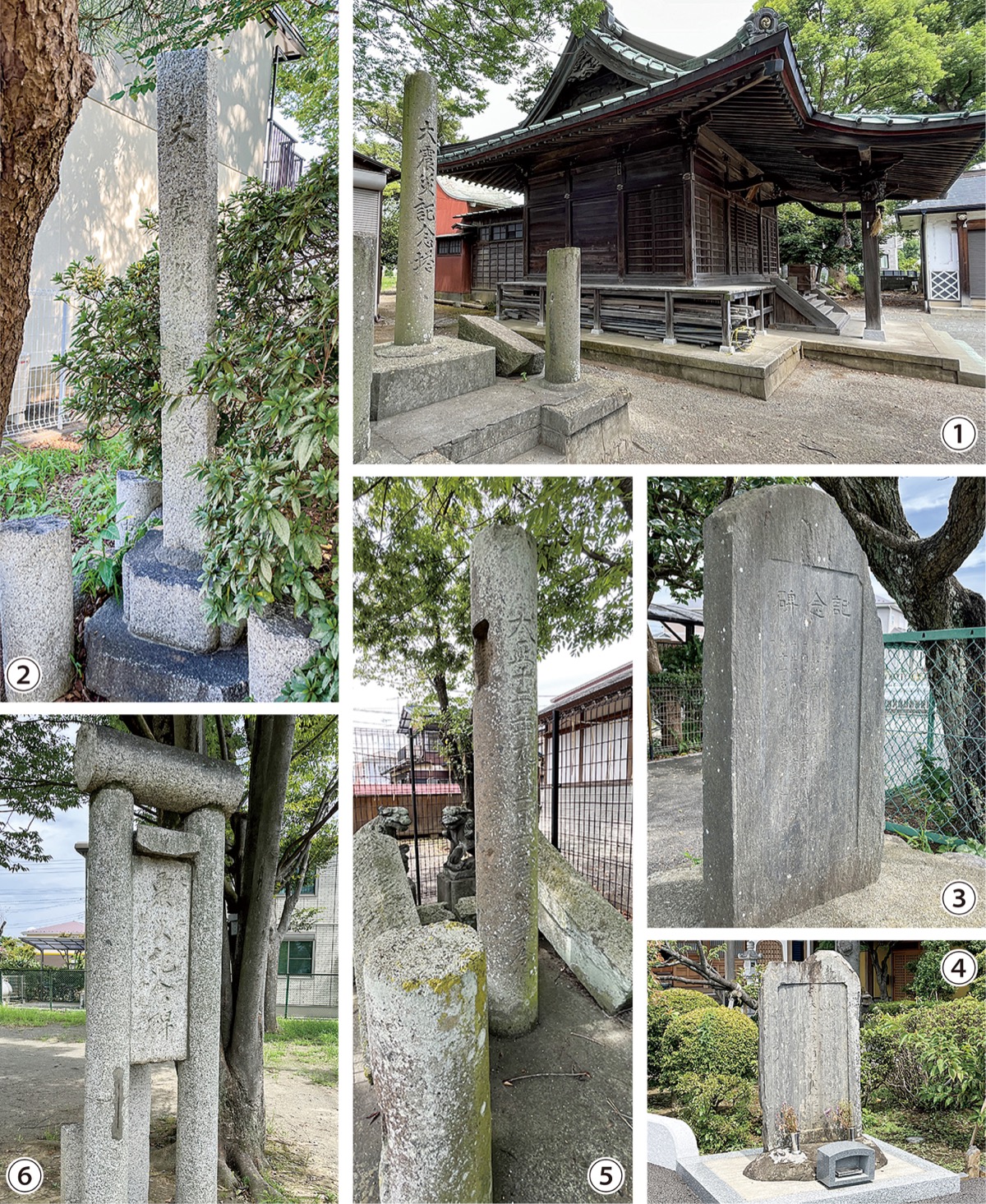 この神社には徳川家に仕えた高木清秀の家臣団の内田、遠藤、盛屋、杉本、鈴木、小川の6氏がこの地に刀を納めて土着したことを伝える「六刀碑」もある。