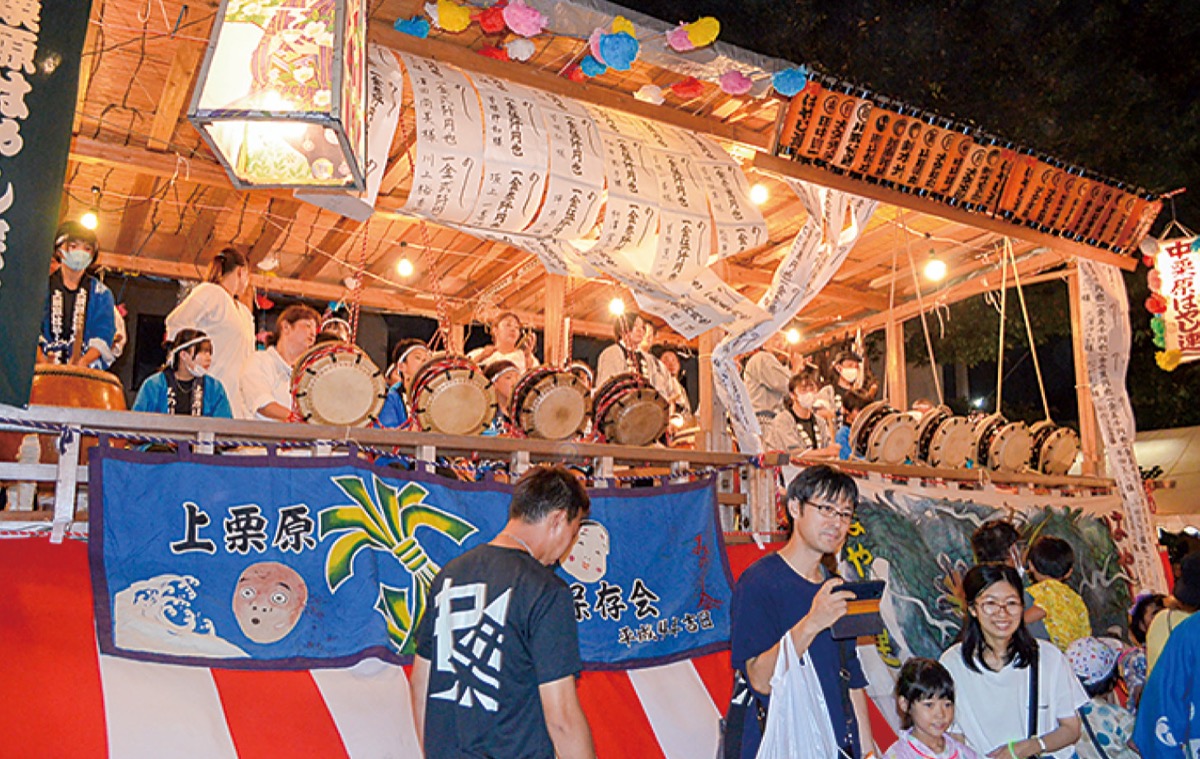 例大祭は毎年9月の最初の金曜日と土曜日に開催される。初日が宵宮、2日目が本祭となる。今年はコロナ禍前と同様に囃子連による櫓席での演奏が復活。栗原地区の囃子連4団体が演奏を披露し、来場者たちの目と耳を楽しませた。