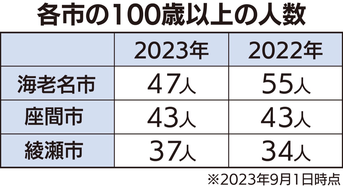 「敬老の日」(9月18日)を前に100歳以上の人口(9月1日時点)が海老名市47人、座間市43人、綾瀬市37人で3市合わせて127人であることが分かった。最高齢は座間市在住で1913(大正2)年生まれの110歳だった。各市では長寿を祝う敬老事業を企画している。