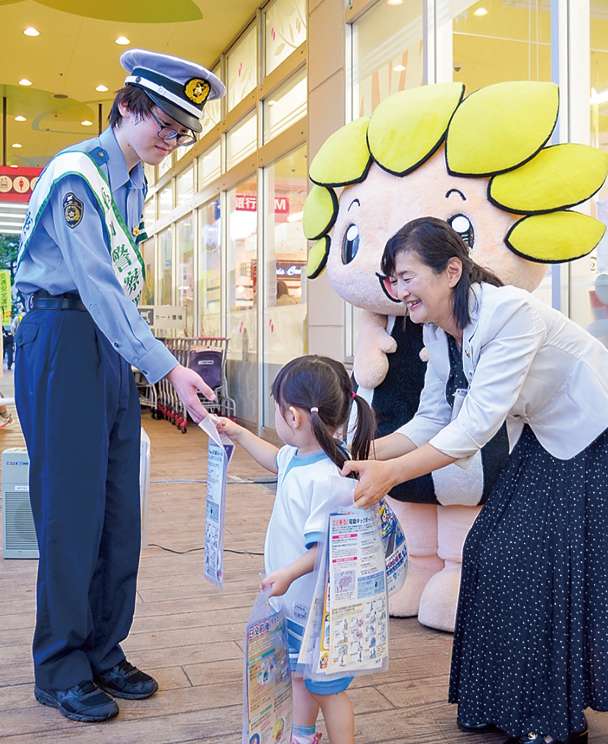 キャンペーンには佐藤弥斗市長や同市マスコットキャラクターの「ざまりん」も駆けつけ、交通ルールの順守や自転車乗車時のヘルメット着用を呼び掛ける啓発グッズを配布した。