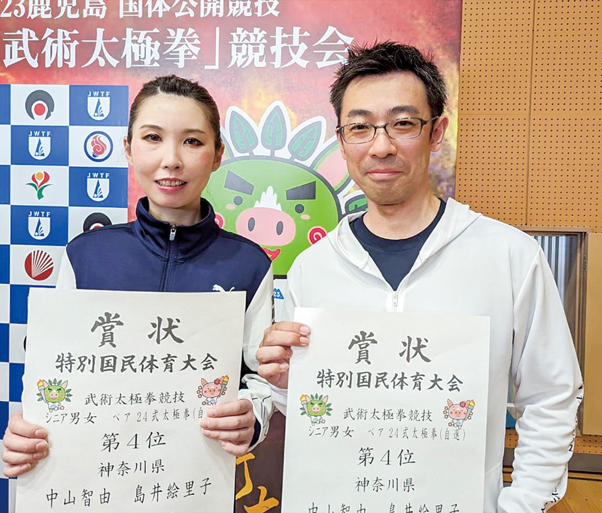 海老名市太極拳協会に所属する島井絵里子さん(45)と大和市太極拳協会の中山智由さん(50)ペアが、9月23日に鹿児島県で開催された国民体育大会の「武術太極拳競技ペア24式太極拳(自選)の部」で4位に入賞した。大会直前に見舞ったアクシデントをものともしない演武を披露した。