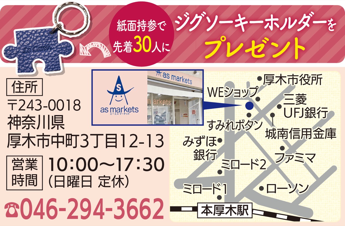 神奈中バスで69歳の誕生日から利用できる「かなちゃん手形」専用のパスケースを本厚木北口から徒歩5分の「asmarkets(エーエスマーケット)」で販売中。価格は2500円。本革製でケースには小さな鈴がついて紛失しにくく、裏面には100円を取り出しやすいポケットが付いている。また聖書カバーやブックカバーの作成も受付中。
