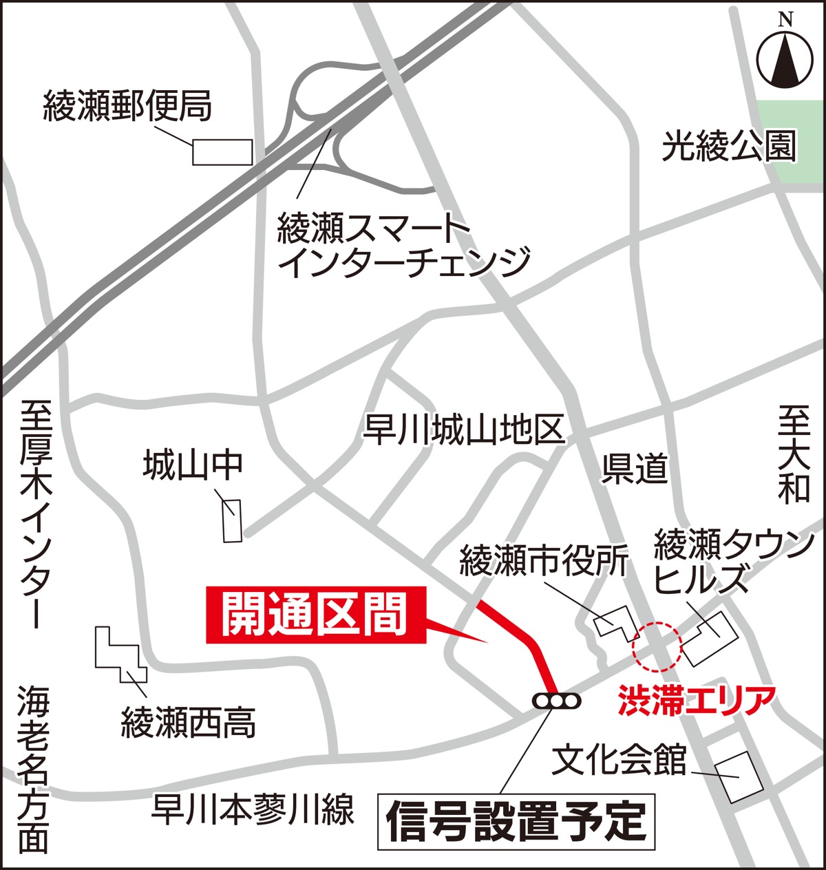 東山線の整備区間は310メートル。片側一車線、幅員16メートルで、市中心部を横断する幹線道路(早川本蓼川線)との接続部分に信号機が設置される。市中心部を縦断し綾瀬市スマートインターに接続する県道と早川本蓼川線が交差する市役所前付近の慢性渋滞の解消にも効果が期待されている。
