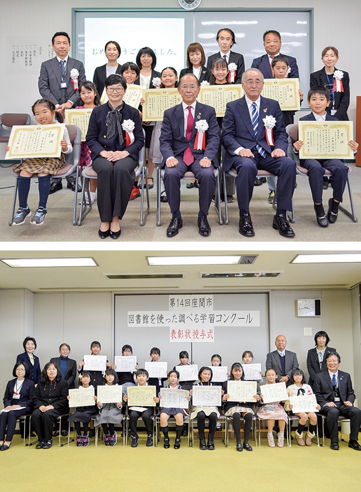 図書館の利用促進を目的とした「図書館を使った調べる学習コンクール」の表彰式が、海老名市と座間市でこのほど開かれ、入賞した児童が表彰状を受け取り笑顔を見せた。