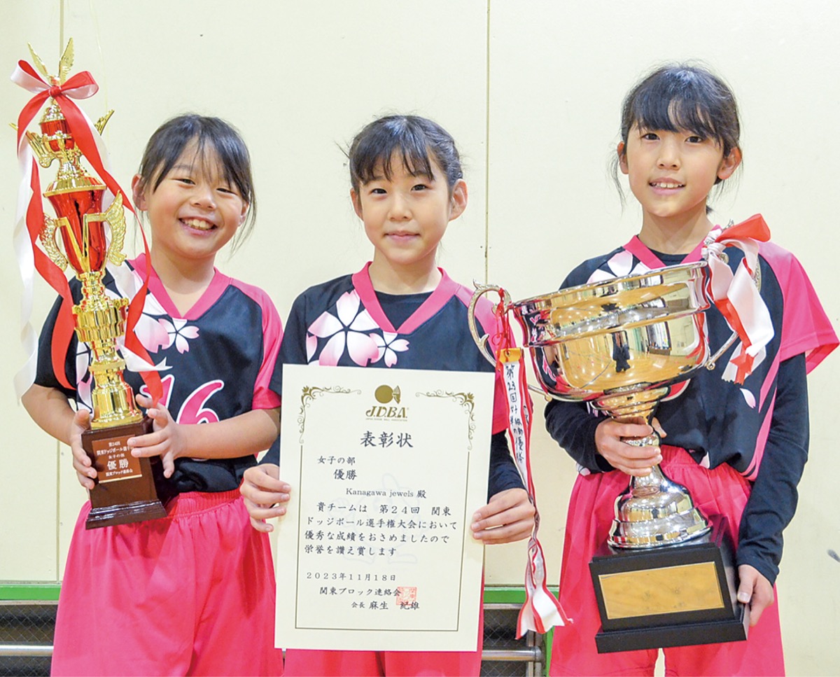 海老名小学校の新美音花さん(5年)、琴葉さん(3年)姉妹と綾西小学校の松岡葉那さん(3年)が所属する女子連合チーム「Kanagawa jewels」(須藤和恵監督)が、11月18日に栃木県で開かれた「関東ドッジボール選手権」で優勝した。