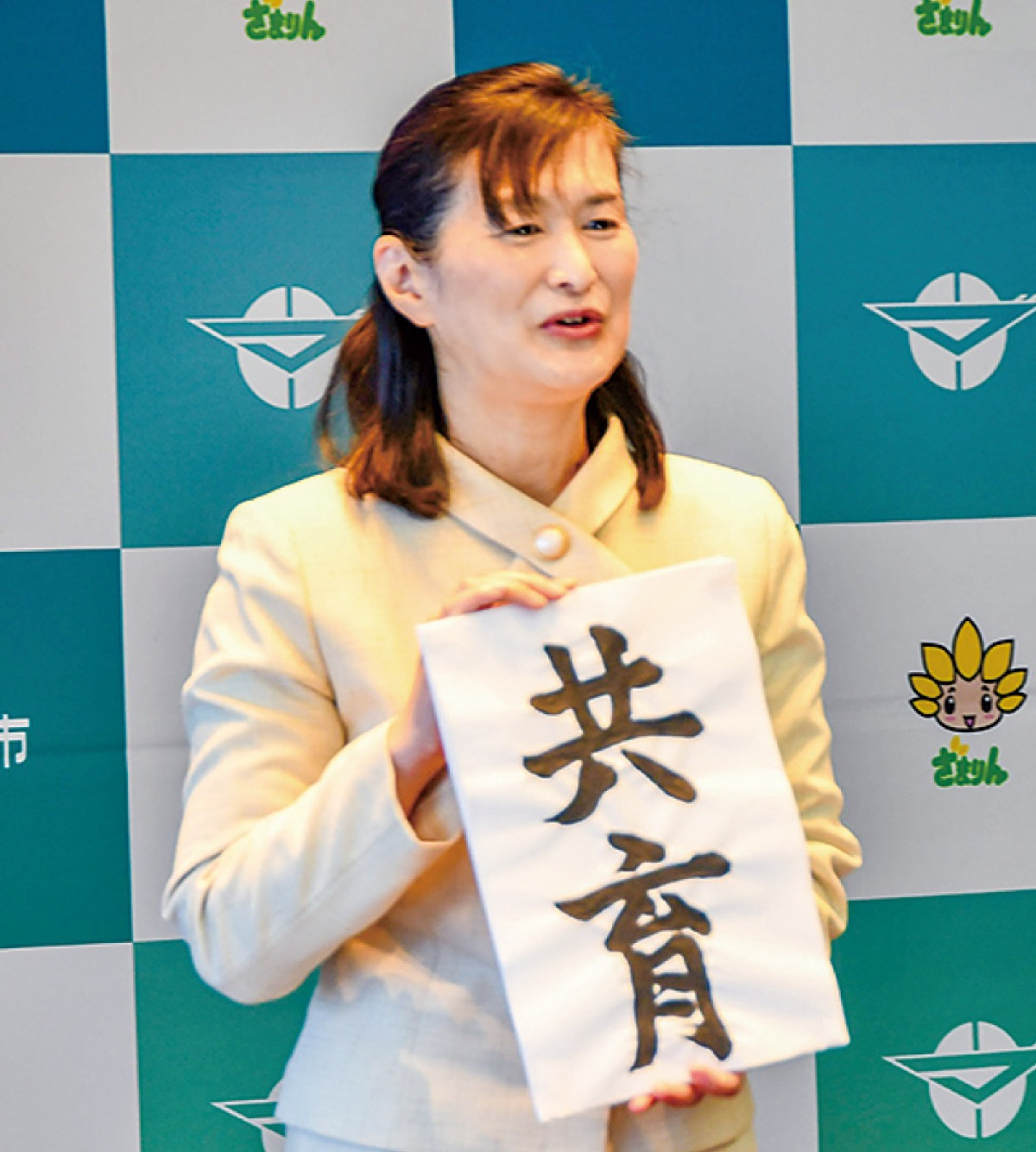 今年1年の目標として自ら書いた「共育」の二文字を掲げ、「これまでまいた政策の種を職員と市民の皆さまと共に育て、大きな木にしたい」と、抱負を述べた。
