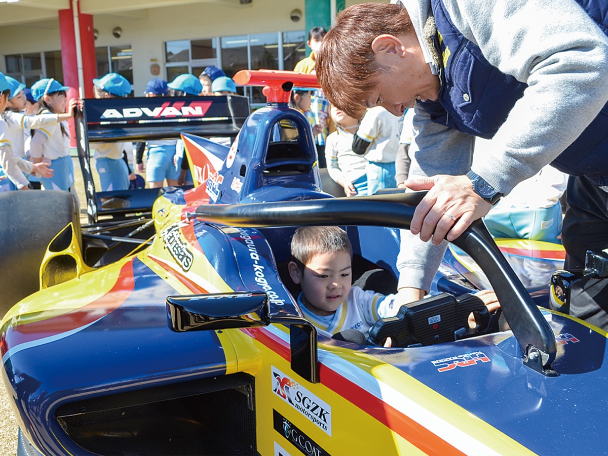 綾瀬市を拠点に活動する「B‐Max Racing Team」(組田龍司総代表)が13日、同市吉岡の私立綾西幼稚園(古郡孔文園長)でスーパーフォーミュラ車両の展示と試乗イベントを実施した。チームによると、幼稚園に車両を運び込み、展示や試乗を行ったのは初めてという。
