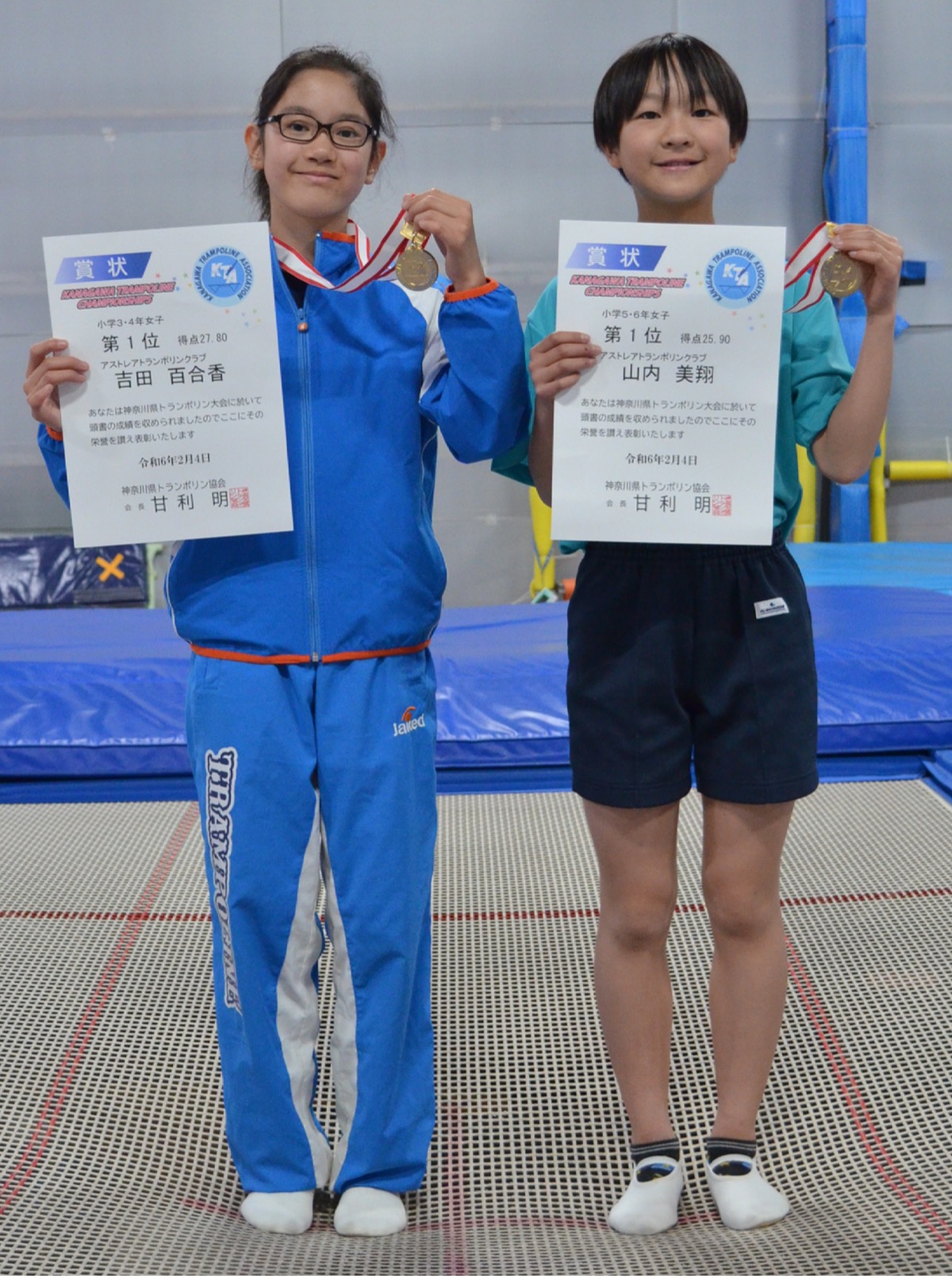 第38回神奈川県トランポリン大会が2月3日から4日かけて厚木市荻野運動公園体育館で行われ、海老名市立社家小学校の山内美翔さん(5年)と同門沢橋小学校の吉田百合香さん(4年)が優勝した。