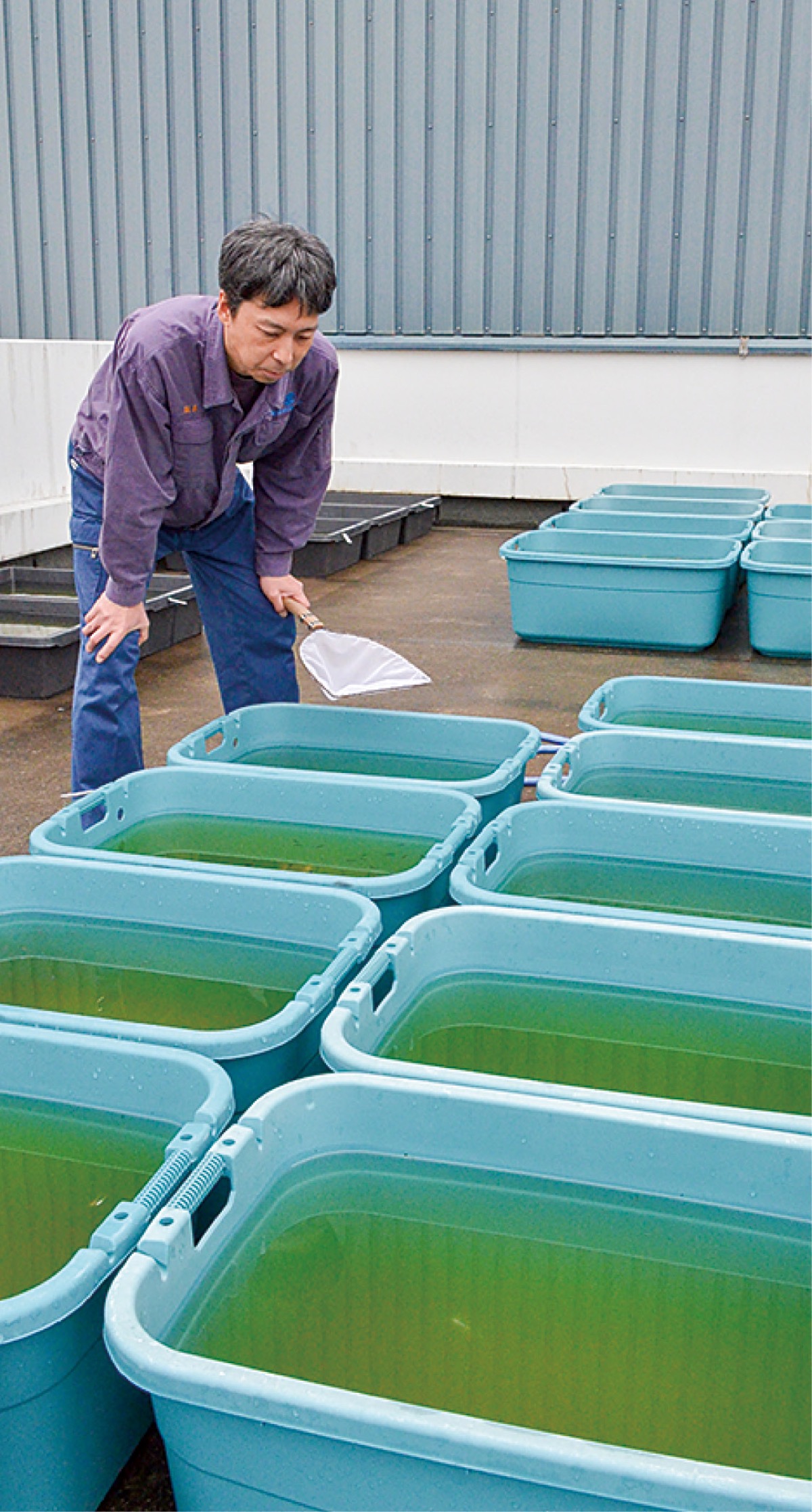 同社は「地域に親しまれる会社づくり」をテーマにグループ3か所の工場からアイデアを募り、グランプリに選ばれた松本進さん=人物風土記が2年前から屋上でメダカの養魚を行っている。
