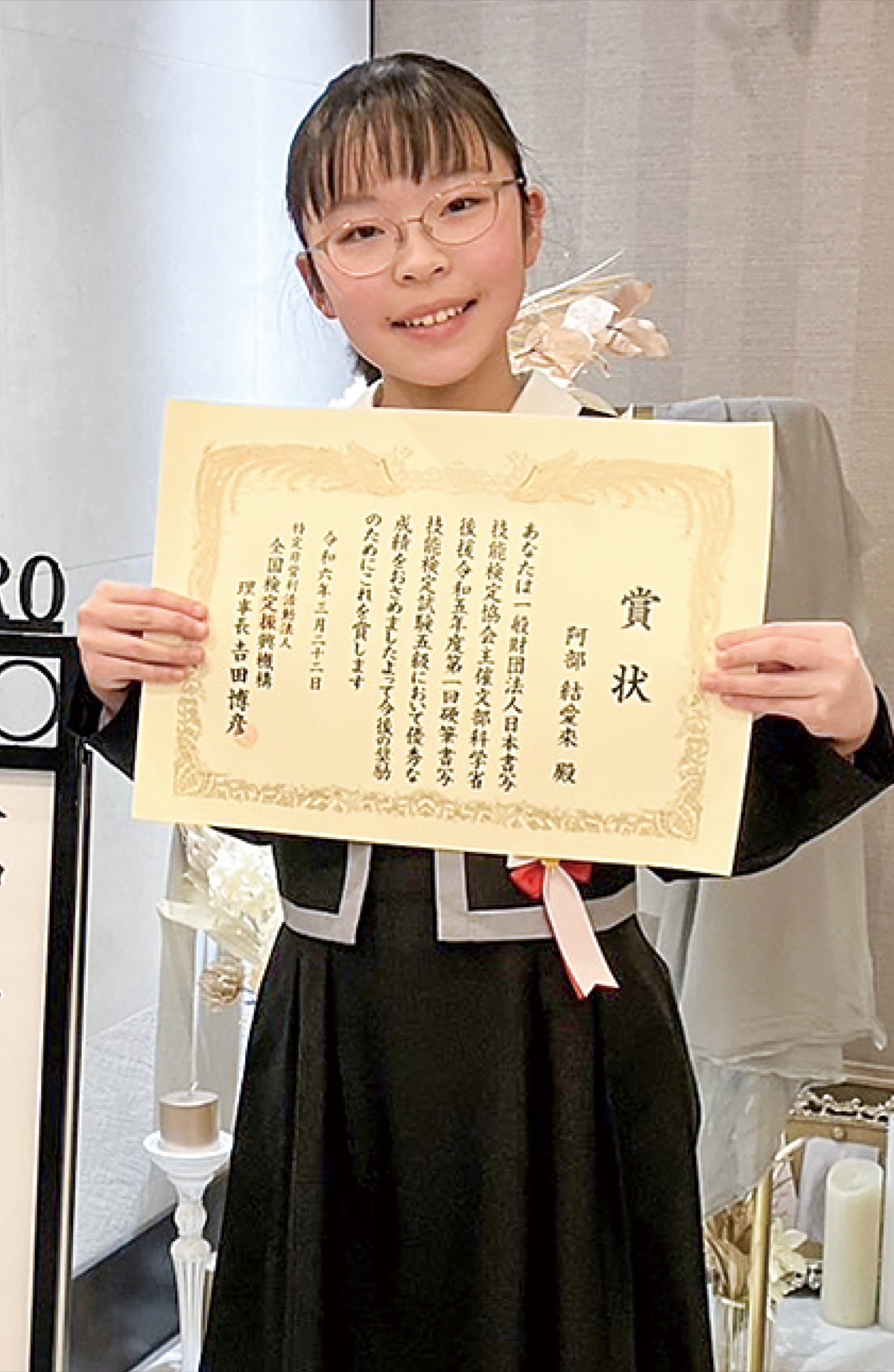 公文あつぎ駅前河の手書写教室(菊地靖子指導者)に通う阿部結愛來さん(今泉小6年)が、硬筆書写技能検定で「全国検定振興機構理事長賞」に選出された。3月22日に東京都で行われた表彰式に出席し、表彰状を受け取った。