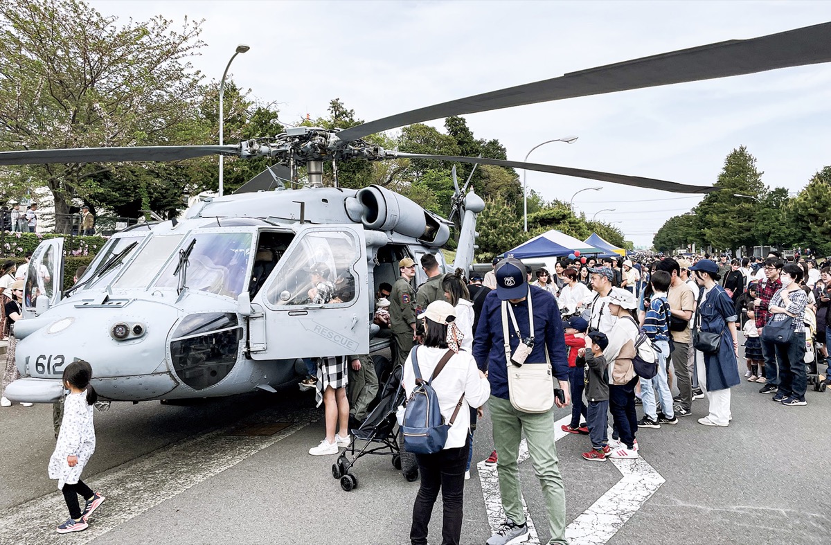 会場内には飲食ブースが軒を連ね、バンド演奏などもお祭り気分を盛り上げた。ヘリコプターや戦闘機の展示もあり、来場者は興味津々の様子で機内を眺めていた。パイロットたちと記念撮影する子どもたちの姿も多く見られ、訪れた人たちは自衛隊や米海軍関係者との交流を楽しんだ。