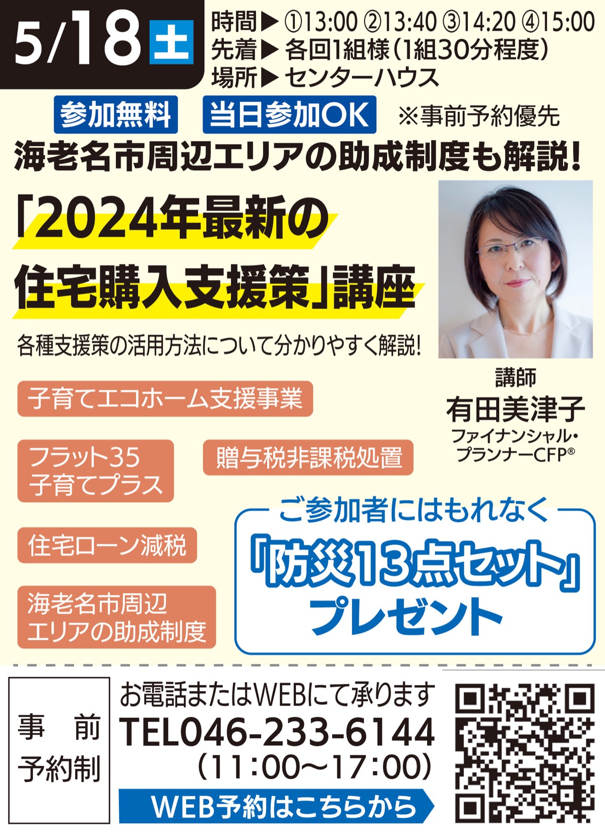 総合住宅展示場「海老名ハウジングギャラリー」では5月18日(土)、海老名市周辺エリアの助成制度も解説する「2024年最新の住宅購入支援策」講座を開催する。参加無料。当日参加OK(※事前予約優先)。各回先着1組限定(全4回)。