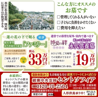 市街地に近いにも関わらず、自然豊かな環境のなか、「いつでも逢えるお墓」として定着している綾瀬中央霊園セントソフィアが永代供養墓に関する個別相談を実施している。