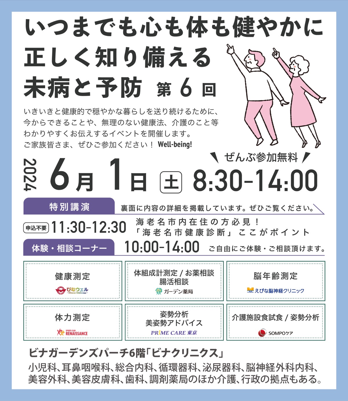 「いつまでも心も体も健やかに」そんな思いを込めた、「健康」に関する催しが、海老名駅間のビナガーデンズパーチ6階「ビナクリニクス」で6月1日(土)に開催される。午前8時30分から午後2時。参加費無料。