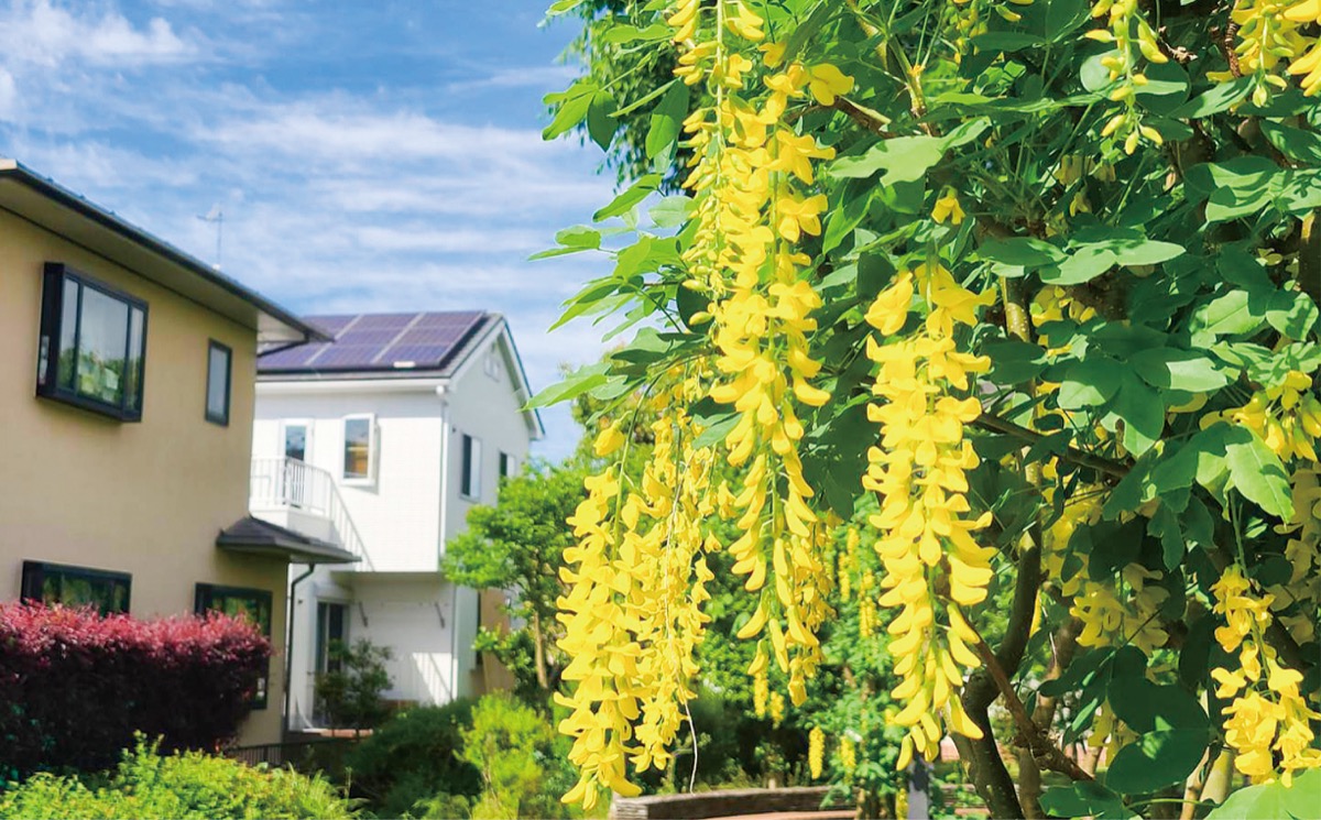 県立相模三川公園(海老名市上郷2の1の1)のイングリッシュガーデン入り口で、キングサリが見ごろを迎え来園者の目を楽しませている=写真5月14日撮影。