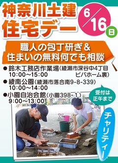 毎年恒例の神奈川土建一般労働組合のイベント「住宅デー」が6月16日(日)、綾瀬市内の3会場で開かれる。【1】鈴木工務店作業場=午前10時〜午後3時【2】綾南公園=午前10時〜午後2時【3】小園自治会館=午前9時〜午後1時。受付は正午まで。