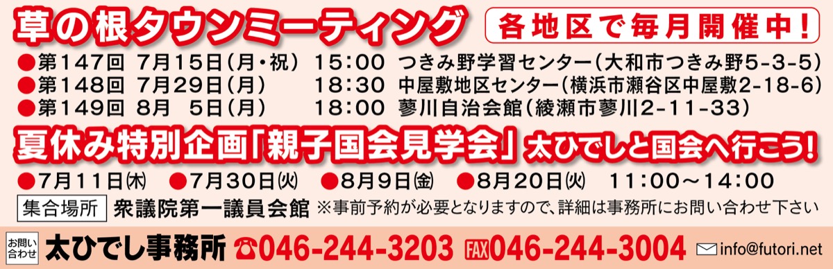 この夏も地元密着で、毎日街頭に立ち、毎月各地でのタウンミーティングと国会見学会を開催して地域の声を直接お聞かせいただきます。ぜひお気軽にご参加ください。