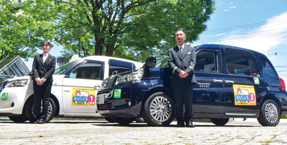 えび〜くるはタクシー4台を使い、来年5月までの平日に運行。65歳以上で免許を持っていない人が事前予約で利用でき、自宅付近から市役所や運動公園、スーパーやコミュニティセンター、医療機関など70の乗降地点をむすぶ仕組み。運賃は1回500円。
