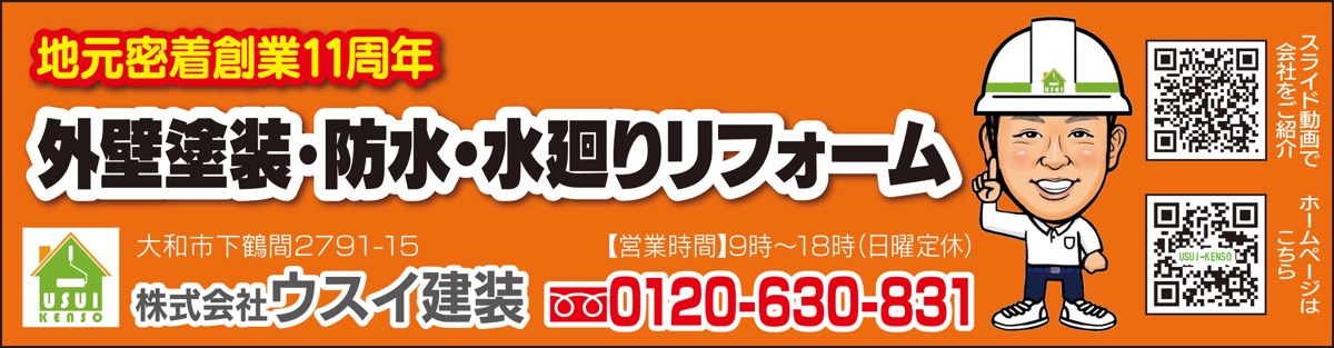 大和市の各地で見かける「オレンジ色」の看板が目印の「株式会社ウスイ建装」(臼井正人代表取締役)は、外壁塗装や防水、水廻りリフォームなど住まい全般のリフォームに親身に対応し、施工実績は年間500件超。「地域密着」を貫く同社への信頼の高さがうかがえる。