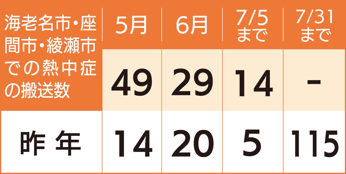 海老名・座間・綾瀬の各消防本部の7月の熱中症搬送は5日時点で一桁にとどまるが、昨年は7月末までに海老名で67件、座間で31件、綾瀬で17件にのぼった。これから月末にかけて搬送が急増する可能性があり、暑さを避けてこまめな水分補給をするなど注意が必要だ。座間市消防本部では「窓を開けて換気する人もいるが外は熱風ということもある。しっかりエアコンを入れて命を守ってほしい」と話す。