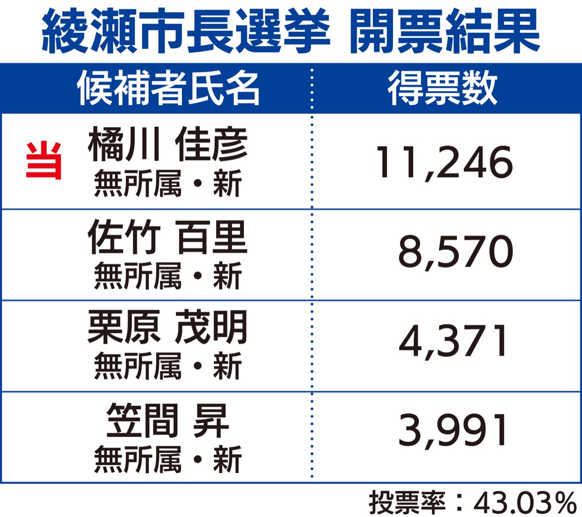 任期満了に伴う綾瀬市長選挙は7月7日に投開票が行われ、元市議の橘川佳彦氏(54)が、無所属新人4人の争いを制して初当選した。「女性初」の市長をめざした佐竹百里氏(54)は3割の票を集めたが及ばなかった。投票率は1978年の市制施行以降の市長選で四番目に低い43・03%、投票が行われた前々回(16年)を11・14ポイント下回った。