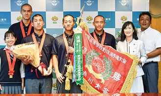 第106回全国高等学校野球選手権大会に出場する東海大相模の原俊介監督と選手らが7月30日に座間市役所を訪問し、佐藤弥斗市長ら関係者に甲子園出場を報告した。