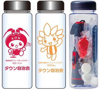 タウンニュース社では昨年来、この防災ボトルの普及に取り組んでいる。このほど新たに海老名市と座間市のマスコットキャラクターに、団体名が印刷できるオリジナル防災ボトルの提供を始めた。