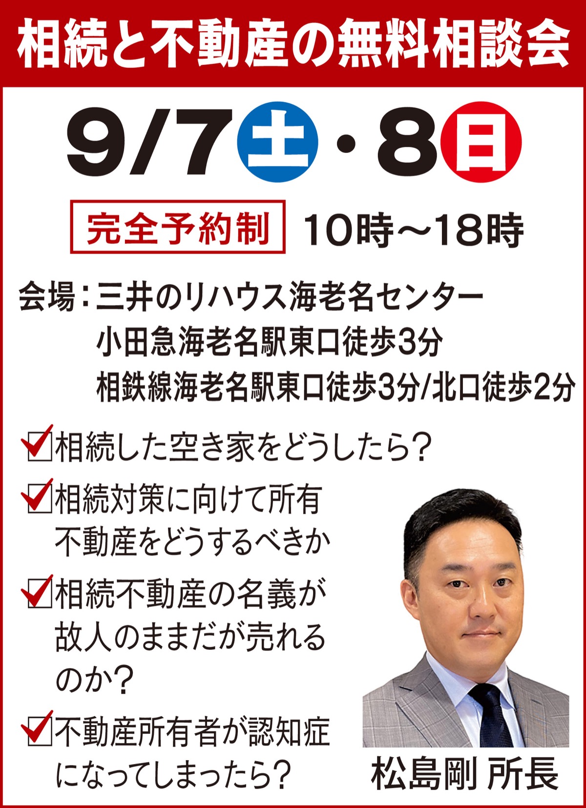 家族の集まりで話題になった「相続した空き家」「放置した土地」――この文言にピンと来た人に勧めたいのが、海老名駅そば、三井のリハウス海老名センターの「相続と不動産の個別無料相談会」。開催日時は9月7日(土)・8日(日)の週末2日間。時間は午前10時〜午後6時のうち1時間。秘密厳守のため、完全予約制。