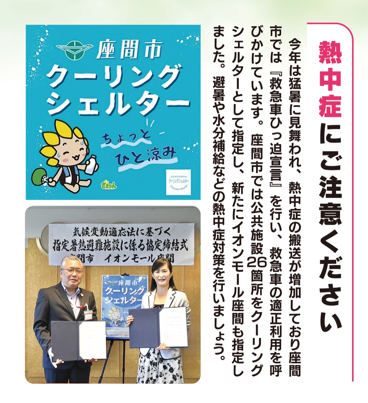 今年は猛暑に見舞われ、熱中症の搬送が増加しており座間市では『救急車ひっ迫宣言』を行い、救急車の適正利用を呼びかけています。座間市では公共施設26箇所をクーリングシェルターとして指定し、新たにイオンモール座間も指定しました。避暑や水分補給などの熱中症対策を行いましょう。