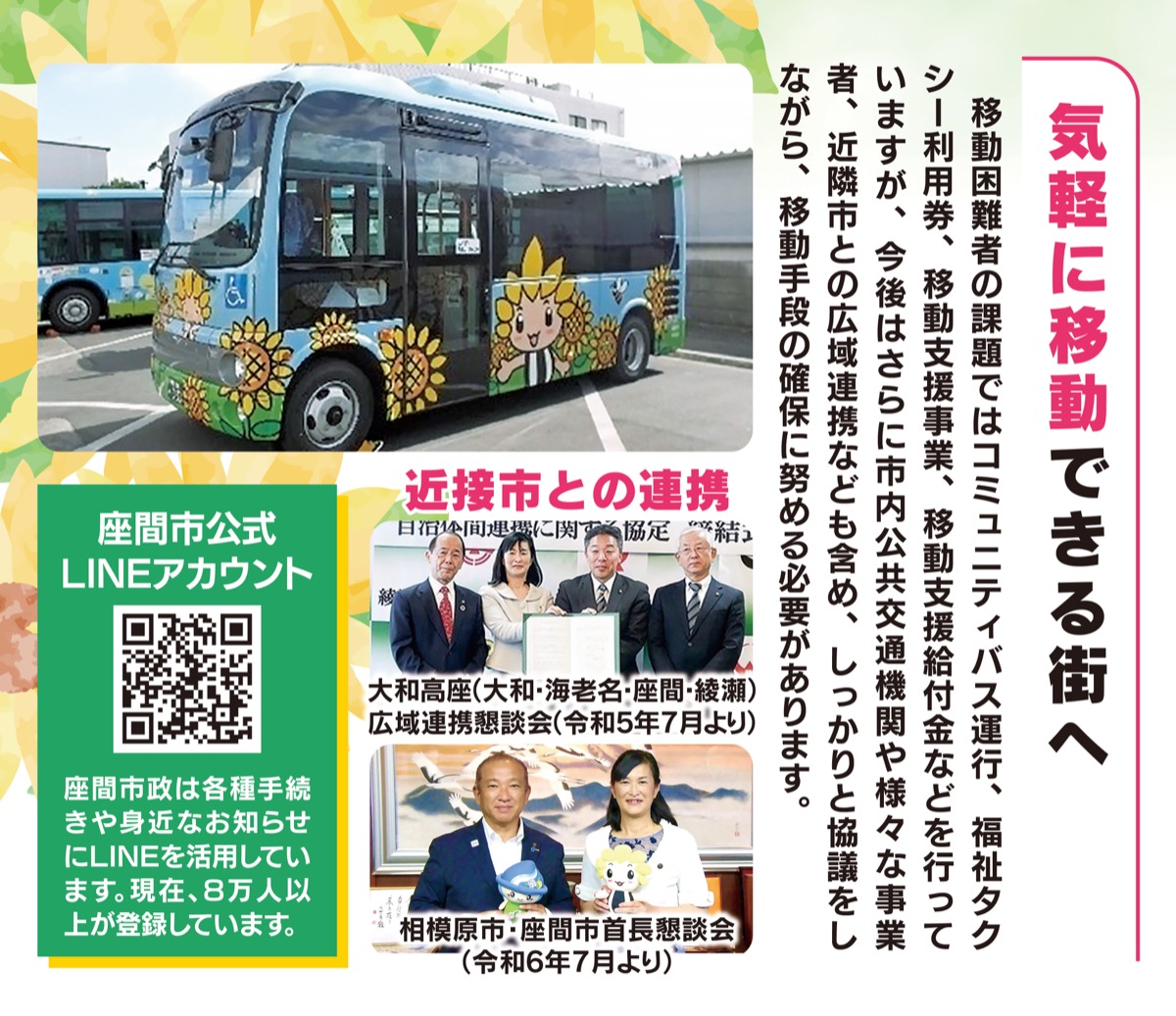 移動困難者の課題ではコミュニティバス運行、福祉タクシー利用券、移動支援事業、移動支援給付金などを行っていますが、今後はさらに市内公共交通機関や様々な事業者、近隣市との広域連携なども含め、しっかりと協議をしながら、移動手段の確保に努めて参ります。