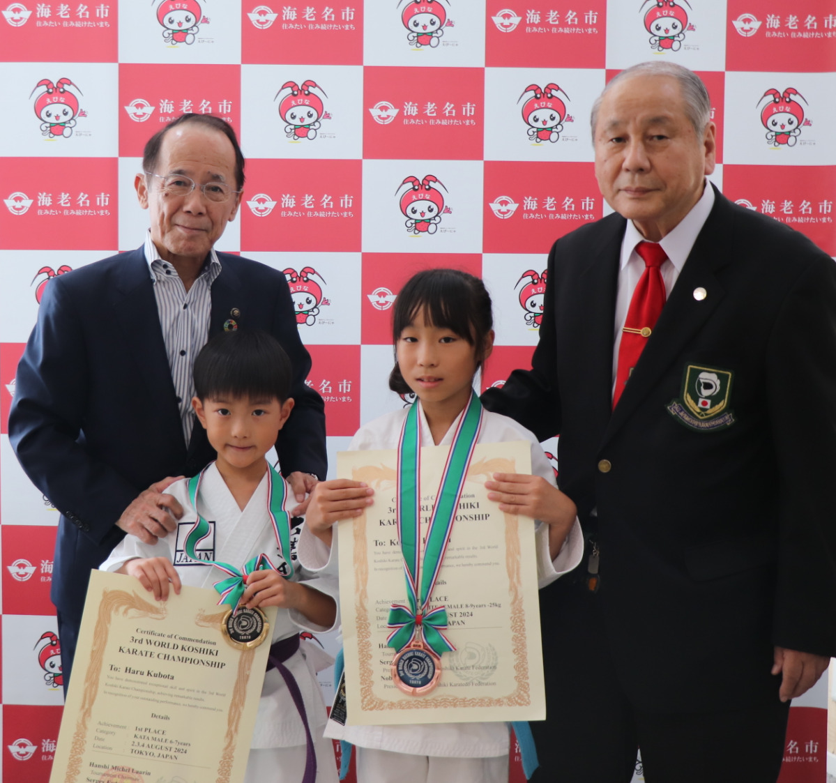 海老名市で活動している「空手道イーグル会」(大塚将二稜総師範)に所属する久保田晴さん(有馬小2年)と小島心結さん(大谷小3年)が8月28日、市役所で内野優市長に「第3回世界硬式空手道選手権大会」の優勝と3位入賞を報告した。
