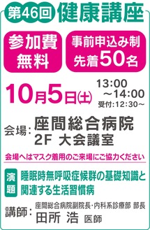 医療の最新情報や予防知識を学ぶ健康講座が10月5日(土)、座間総合病院で開かれる。同病院総合診療科の田所浩医師が「睡眠時無呼吸症候群」をテーマに講演する。事前予約制。