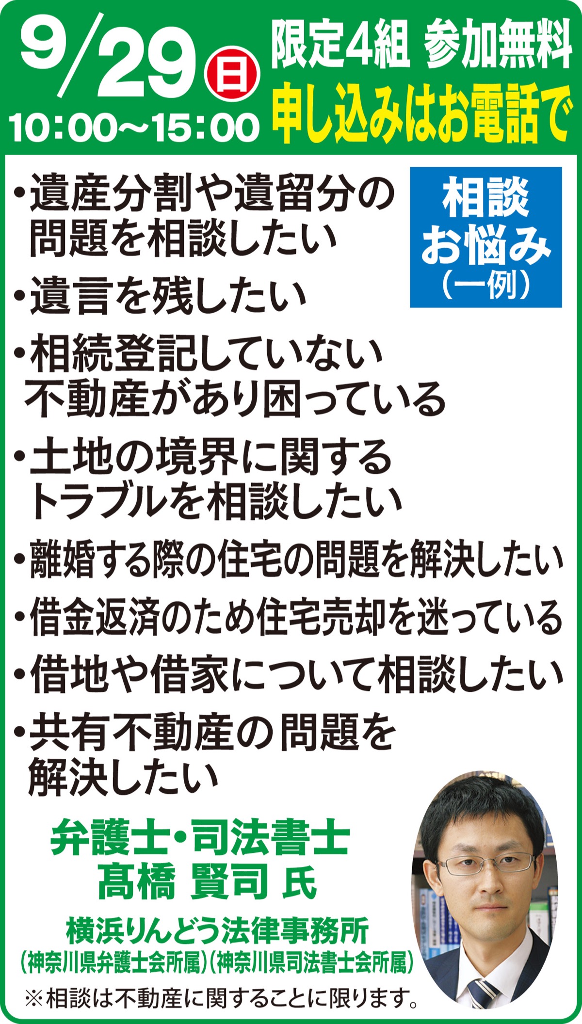 相鉄不動産販売・海老名店では、弁護士による相続・不動産の無料個別相談会を9月29日(日)に行う。相談を受けるのは弁護士・司法書士の高橋賢司氏。相続や債務整理、離婚時の財産分与などを中心に、不動産に関する多くの相談を受けており「今まで悩んでいた問題が解決できた」など参加者から好評だ。