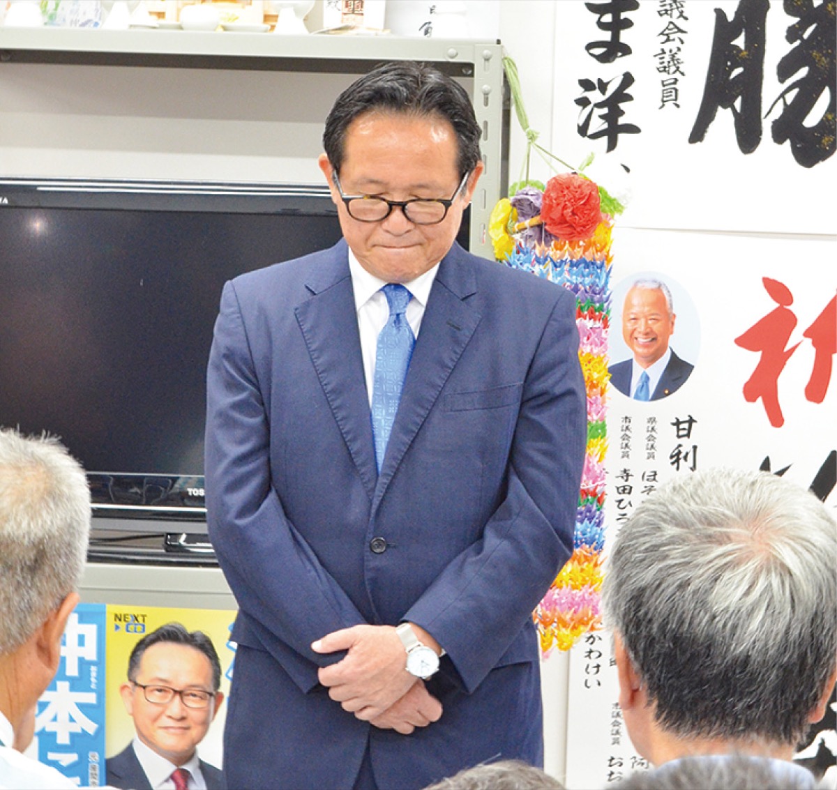 午後11時過ぎ、事務所に入った沖本氏は支援者を前に、「期待に応えられず申し訳ない。結果はしっかりと受け止めなければならい」などと述べて頭を下げた=写真。「手応えはあった。短期間で精一杯やりきったが有権者への理解が広がらなかった」と述べた。