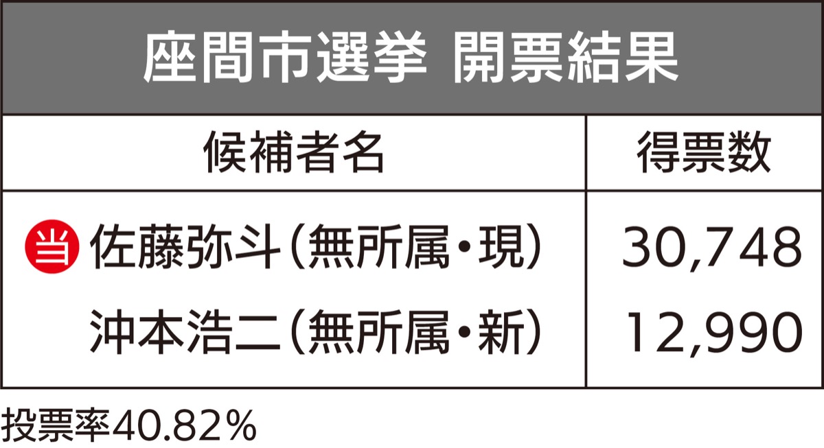 任期満了に伴う座間市長選挙が9月22日に投開票され、現職の佐藤弥斗氏(54)が元市議会議長の沖本浩二氏(64)を退けて再選を果たした。投票率は1971年の市制施行以降の市長選で最低の40・82%で、前回(20年)を4・18ポイント下回った。