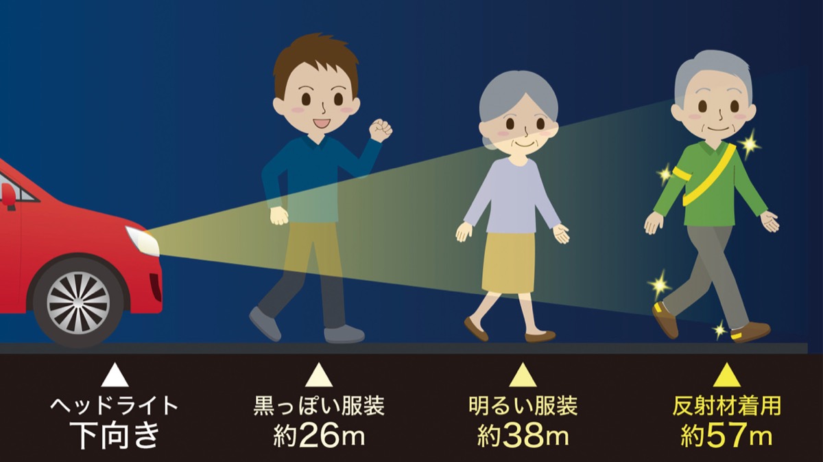 年末にむけ日没が早まるこれからの季節。日没は12月末には約45分早くなる。 車のドライバーに自分を発見してもらうためには反射材が効果的だ。車が時速60Kmでライトを下向きに走った場合、下のように見える。