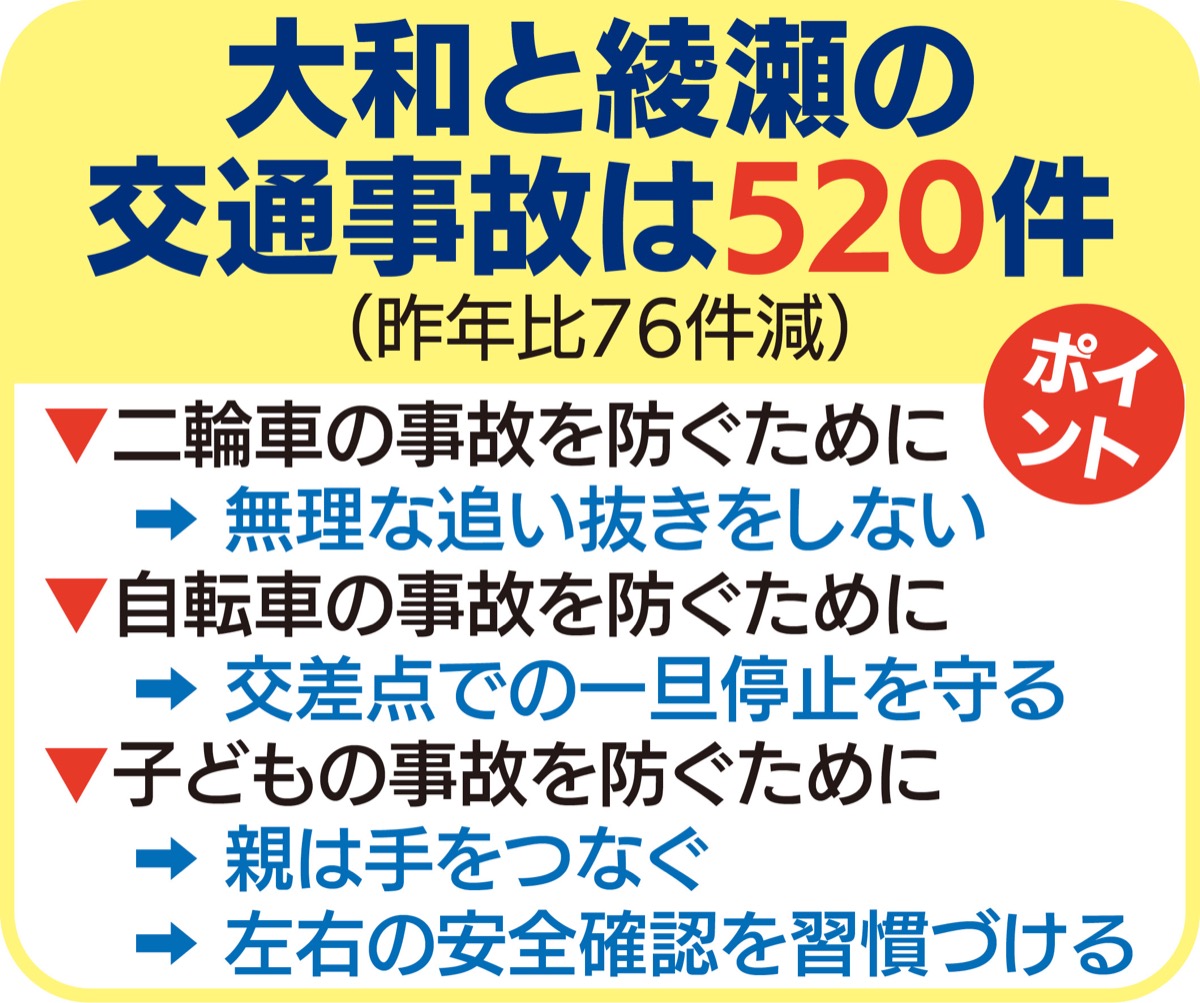 大和警察署の交通課ニュースによると、地元で交通事故の発生が多いエリアは、大和市は大型ショッピング施設や国道246号と16号がある下鶴間地区、綾瀬市では県道42号と市役所南通りがある深谷中・深谷上が目立つ。1週間で見ると、日曜日が少なく、木曜日の事故発生件数が一番多い。発生時刻では大和市が午前8時〜10時、綾瀬市は午後4時から6時が多く、出退勤タイムに重なっている。