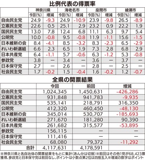 党派別の得票率が県内トップの自民(24・9%)は、全県で前回(2021年)比9・3ポイント減、綾瀬で8・9ポイント、座間9・8ポイント、海老名では10・9ポイント減らした。海老名では立民に126票及ばなかった。県内19市では相模原、鎌倉、藤沢、逗子、海老名の5市で自民が立民を下回った。
